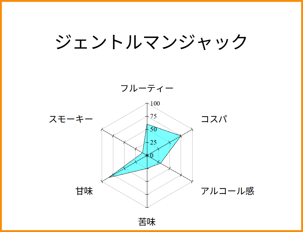 ジェントルマンジャックの味を・フルーティー・スモーキー・甘味・苦味・アルコール感・コスパの6項目を100点満点で評価します。