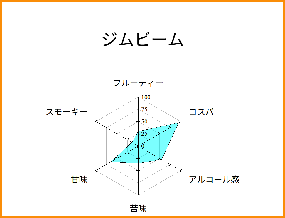 ジムビームの味を・フルーティー・スモーキー・甘味・苦味・アルコール感・コスパの6項目を100点満点で評価します。
