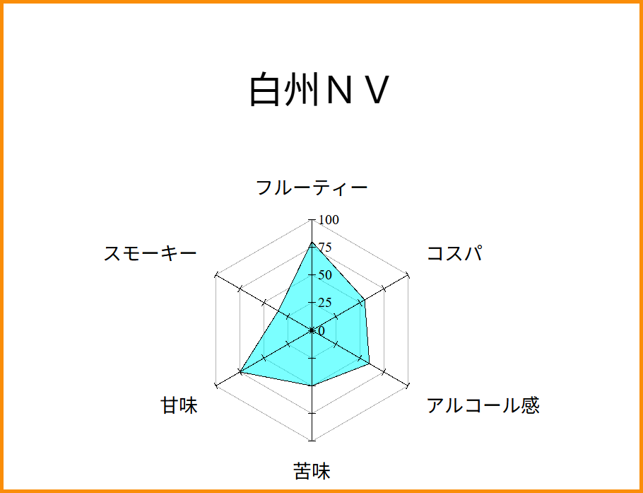 白州NVの味を・フルーティー・スモーキー・甘味・苦味・アルコール感・コスパの6項目を100点満点で評価します。