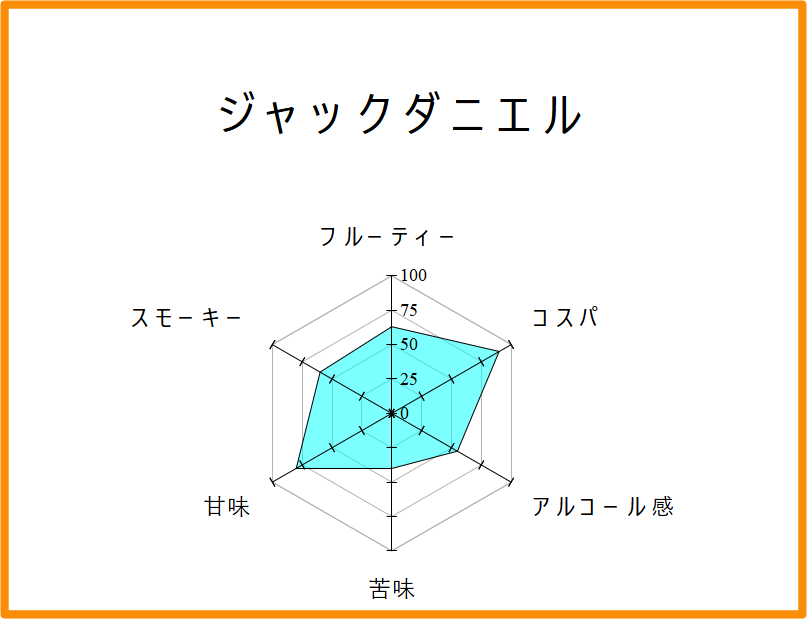 ジャックダニエルの味を・フルーティー・スモーキー・甘味・苦味・アルコール感・コスパの6項目を100点満点で評価します。